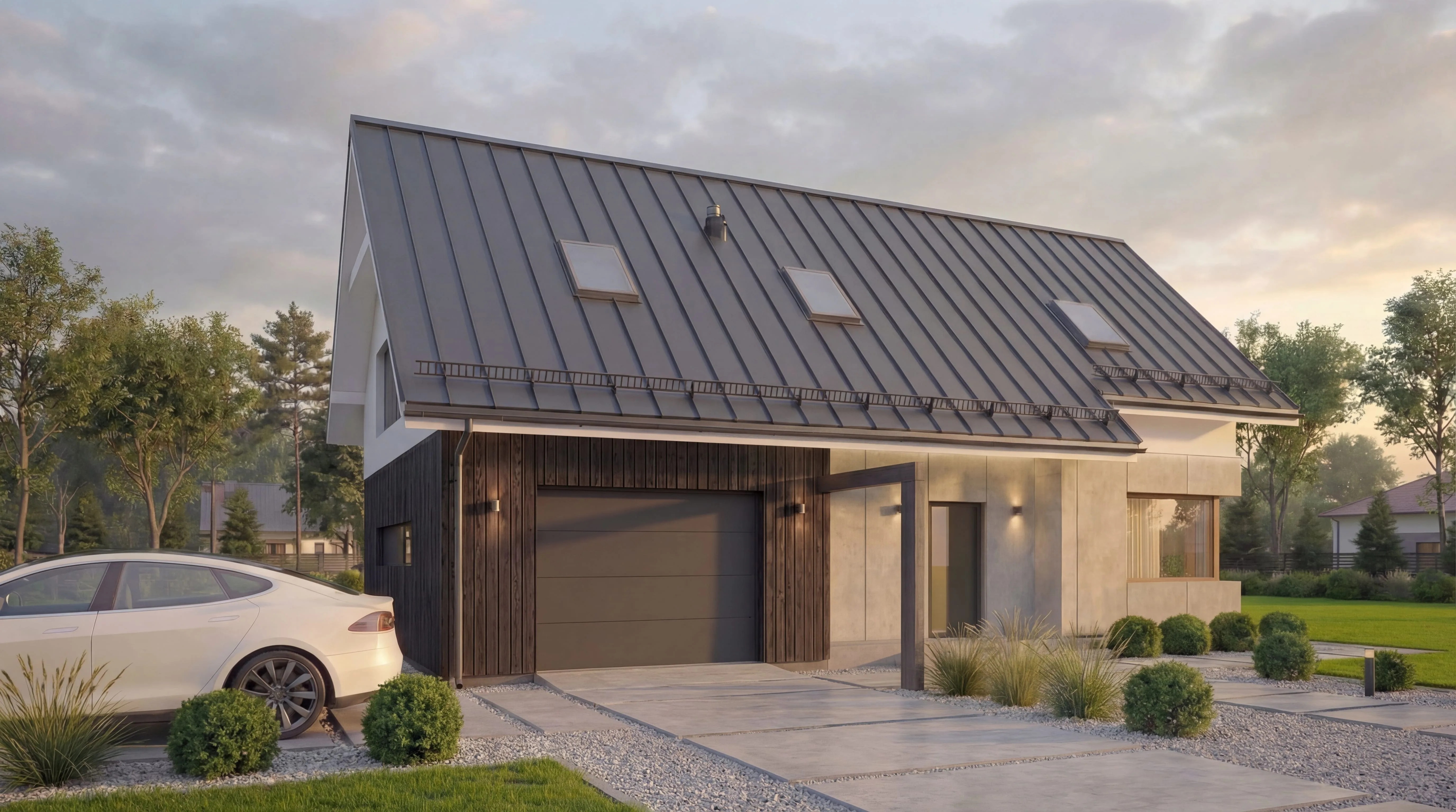 Rysunki elewacji, przekrój budynku oraz plan usytuowania na działce.