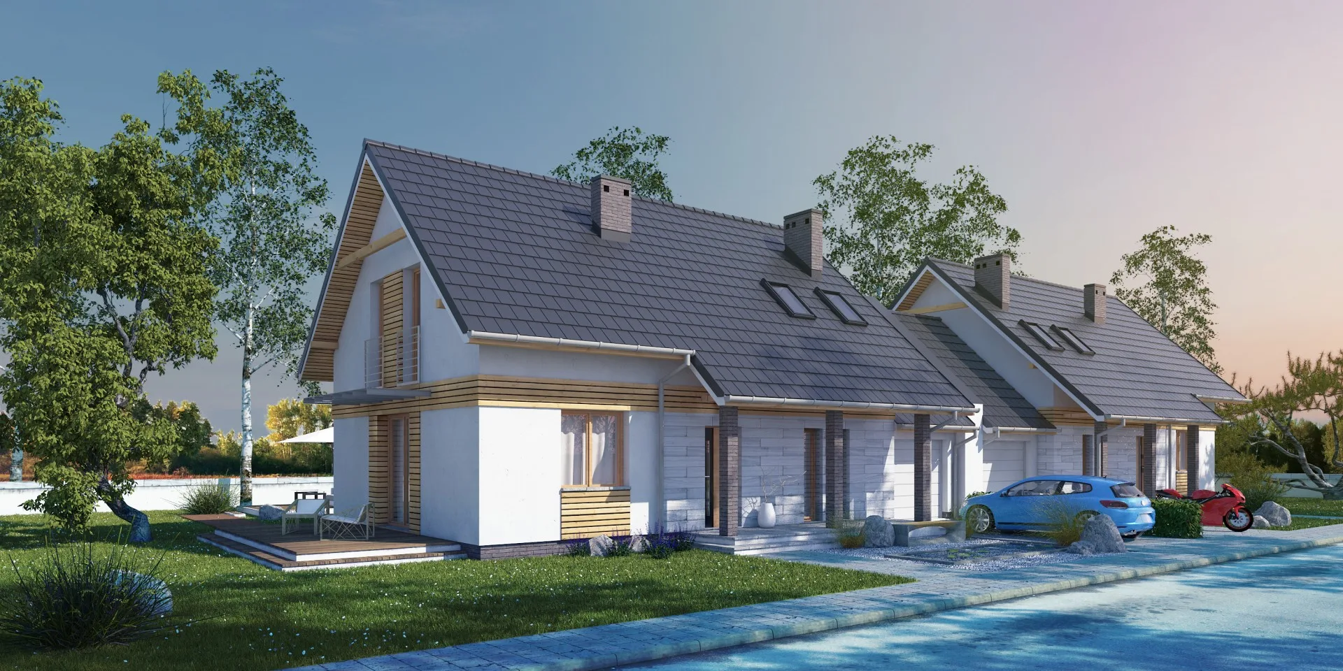 Rysunki elewacji, przekrój budynku oraz plan usytuowania na działce.