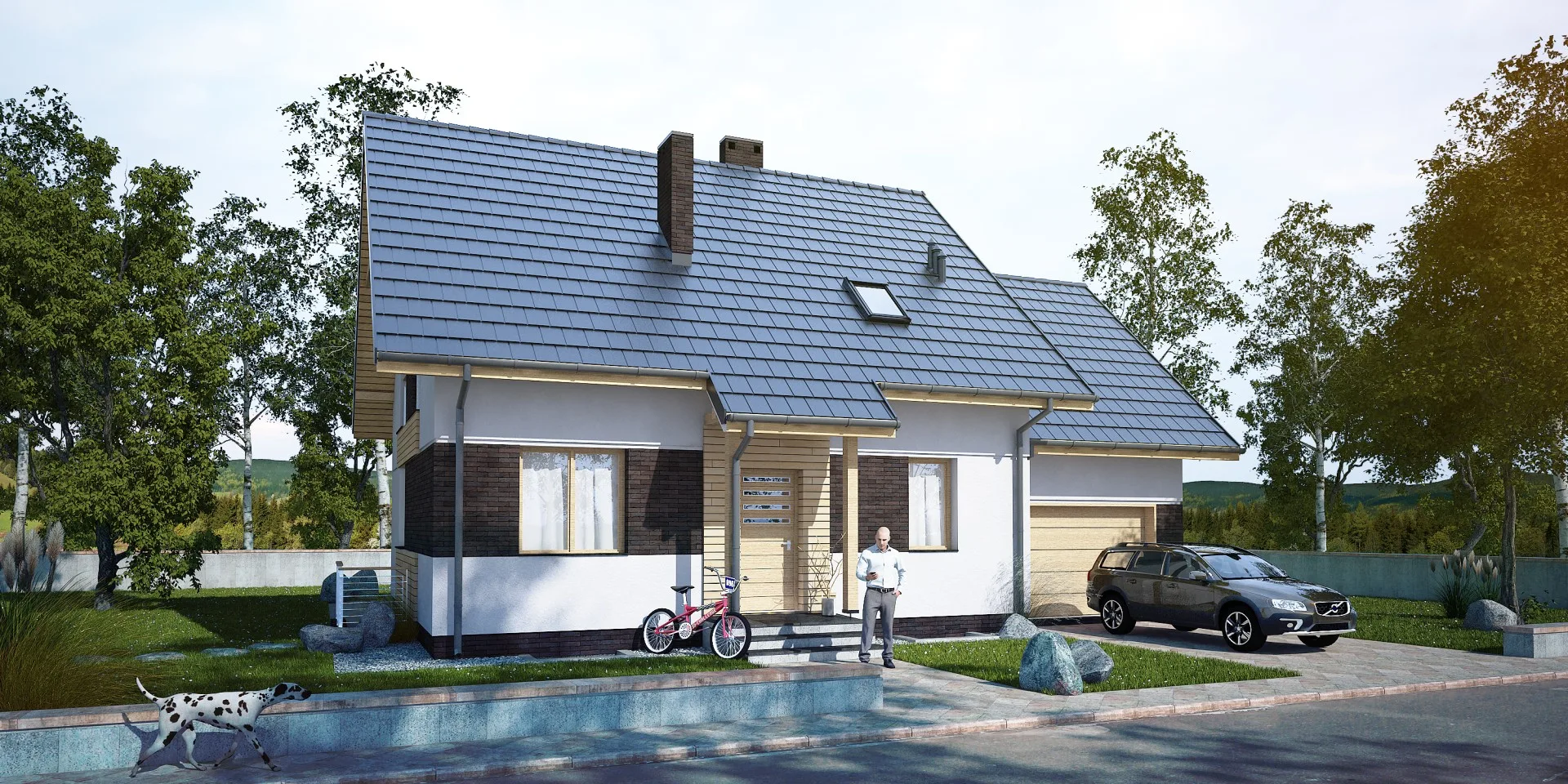 Rysunki elewacji, przekrój budynku oraz plan usytuowania na działce.