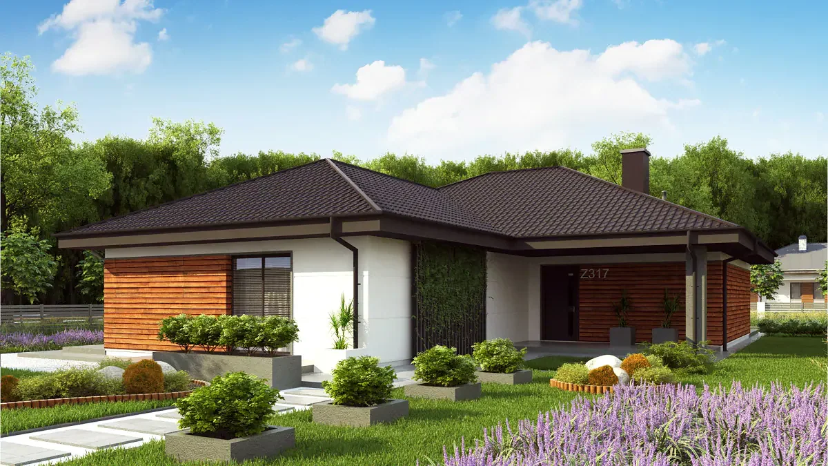 Współczesny dom parterowy z odwróconym układem pomieszczeń, dachem wielospadowym